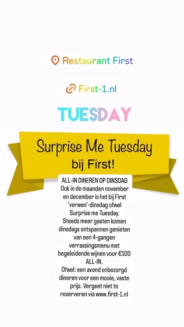 Zomer, vakantiegevoel en lekker eten bij Restaurant First. Van dinsdag t/m vrijdag serveren vanaf 12.00 uur tot 14.00 uur lunch. Zaterdag geen lunch, wél diner vanaf 18.00 uur. Ook voor een drankje met een hapje bent u van harte welkom. Met onze culinaire barbites maakt u het relaxen compleet. Beleef de ultieme zomer ervaring op ons terras!